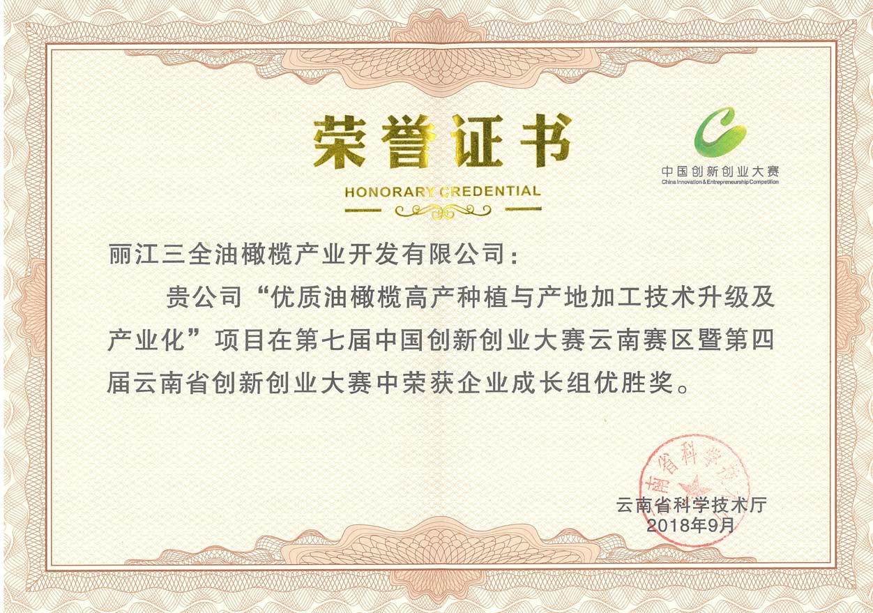 我公司“優(yōu)質(zhì)油橄欖高產(chǎn)種植與產(chǎn)地加工技術(shù)升級(jí)及產(chǎn)業(yè)化”項(xiàng)目在第七屆中國(guó)創(chuàng)新創(chuàng)業(yè)大賽云南賽區(qū)暨第四屆云南省創(chuàng)新創(chuàng)業(yè)大賽中獲得企業(yè)成長(zhǎng)組優(yōu)勝獎(jiǎng)。